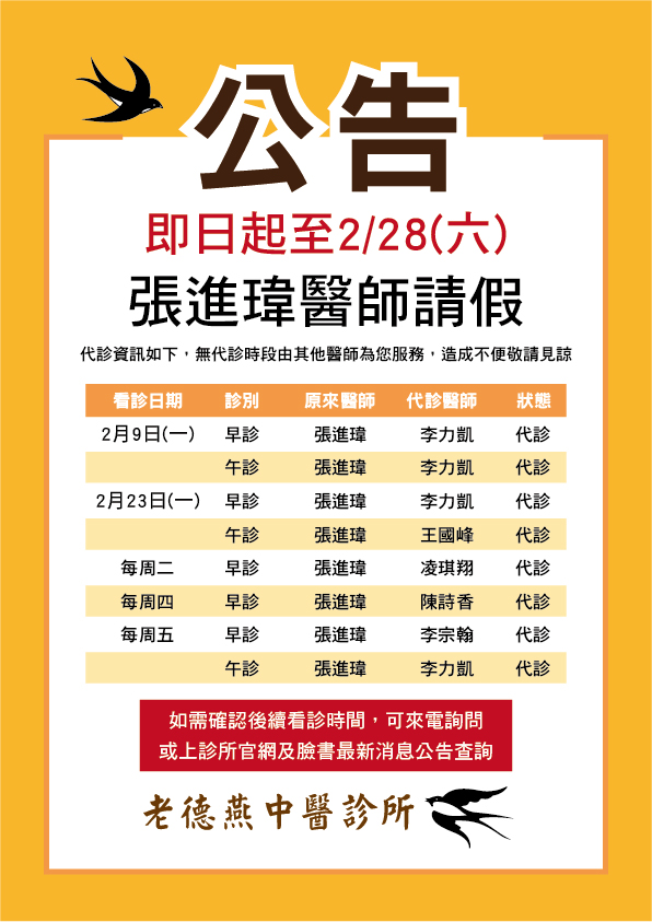張進瑋醫師2/2(一)至2/28(六)延長休診
