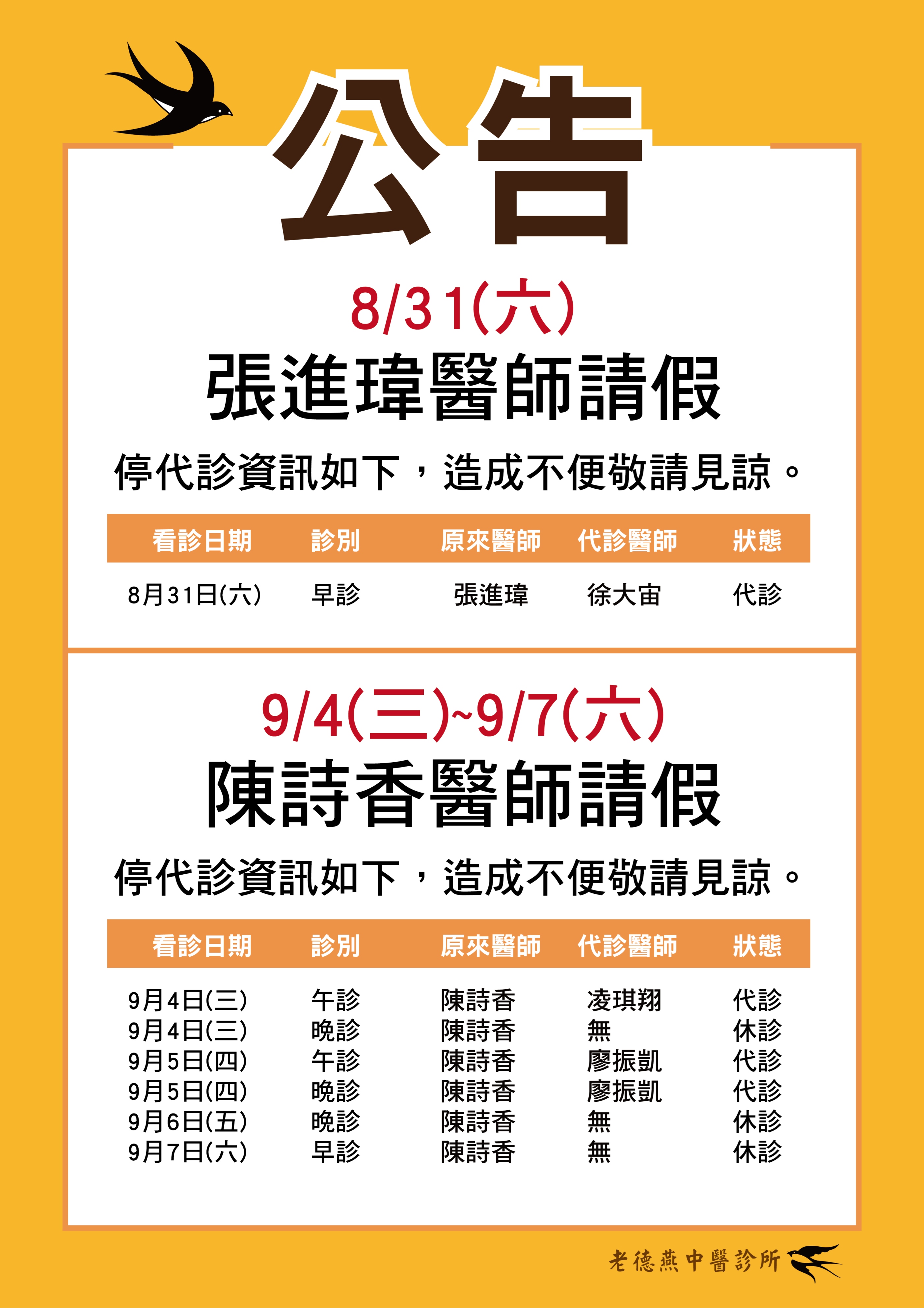 陳詩香 醫師 9/4(三)~9/7(六) 休診
